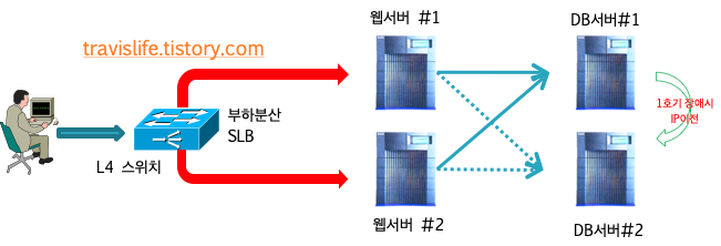 - L4 스위치 등의 부하분산(SLB) 로드밸런싱을 통해 기능 또는 성격 등에 따라 1번 또는 2번 서버로 나누어서 처리하도록 구성