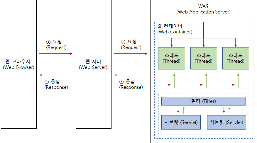 Web Container(웹 컨테이너)는 요청되는 URL과 매핑되는 서블릿을 호출하기 위해 스레드를 생성하고 서블릿을 처리합니다. (WAS가 처리하는 것이 Web Container입니다. 설명을 위해 표시한 겁니다.)