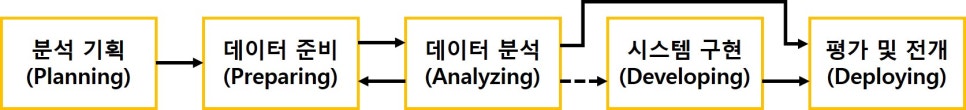 업무 이해 -> 데이터 이해 -> 데이터 준비 -> 모델링 -> 평가 -> 전개